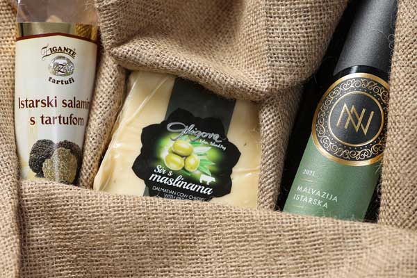 Malvazija Novacco 0,75L suho vino, istarski salamin s tartufom 200g Zigante, ekstra djevičansko maslinovo ulje 0.25l Orgula, sir s maslinama 125g Gligora, eko lux karton kutija, dekoracija