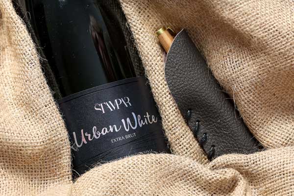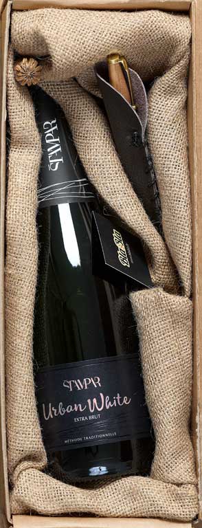 Pjenušac Urban White Štampar 0,75L, kemijska olovka od maslinova drva u kožnom etuiu, eko lux karton kutija, dekoracija