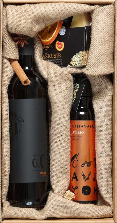 Dingač Crna ovca 0,75L suho vino, Paški sir specijalno pakiranje 325g Gligora, maslinovo ulje Chiavalon 0,25L, eko lux karton kutija, dekoracija