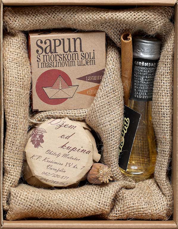 Sapun lavanda cimet Sapunoteka 115g, džem kupina Opg Matučec 106g, liker lješnjak Primores 0,05l, eko lux karton kutija, dekoracija