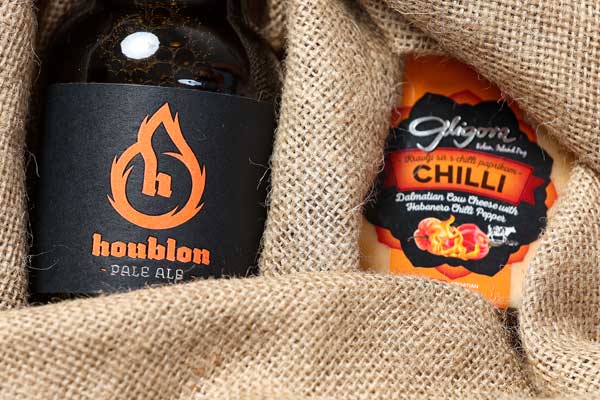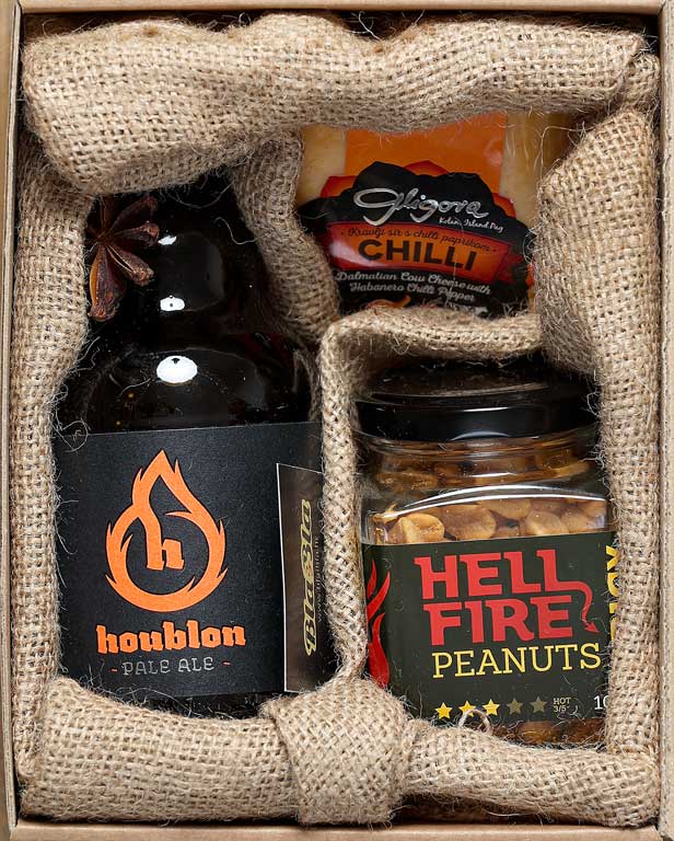 Pivo Pale Ale 0,33L Houblon, sir chilli 125g Gligora, Hellfire peanuts spicy 100g, eko lux karton kutija, dekoracija