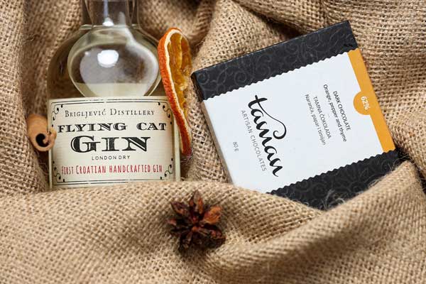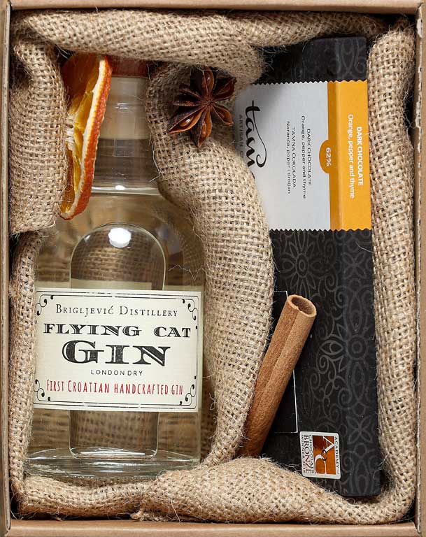 Gin Flying cat 0.2l Brigljević, tamna čokolada 62% naranča, papar i timijan, eko lux karton kutija, dekoracija