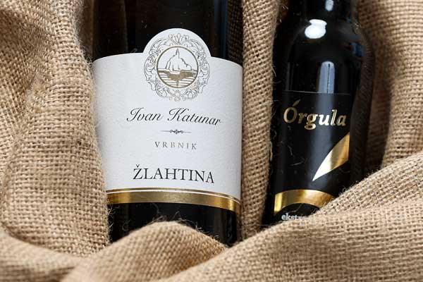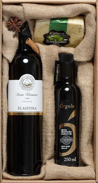 Žlahtina Ivan Katunar 0,75L suho vino, ekstra djevičansko maslinovo ulje 0.25l Orgula, sir s mediteranskim biljem 125g Gligora, eko lux karton kutija, dekoracija