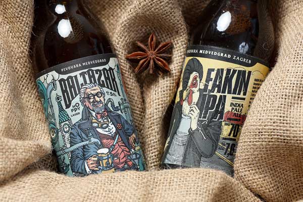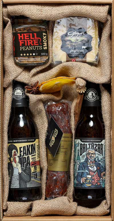 Pivo Baltazar 0.33l Medvedgrad, pivo Fakin 0.33l Medvedgrad, salama od crne slavonske svinje cca 250g Meat the King, sir s paprom 125g Gligora, Hellfire peanuts smoky 100g, eko lux karton kutija, dekoracija