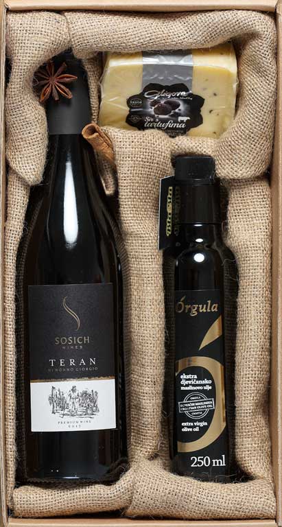 Teran Sošić 0,75L di Nonno Giorgio vrh suho vino, sir s tartufima 125g Gligora, ekstra djevičansko maslinovo ulje 0.25l Orgula, eko lux karton kutija, dekoracija