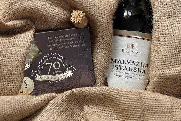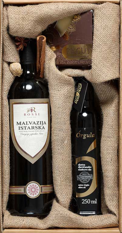Malvazija Istarska Rossi 0.75L suho vino, sir Pagus cca 300g Paška sirana, ekstra djevičansko maslinovo ulje 0.25l Orgula, eko lux karton kutija, dekoracija