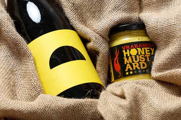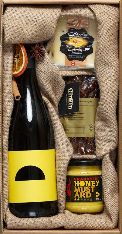 Škrlet Voštinić Klasnić 0,75l, sir bučinim košticama 125g Gligora, kobasica od crne slavonske svinje cca 200g Meat the King, Vrabanero Honey Mustard senf s medom 212ml, eko lux karton kutija, dekoracija